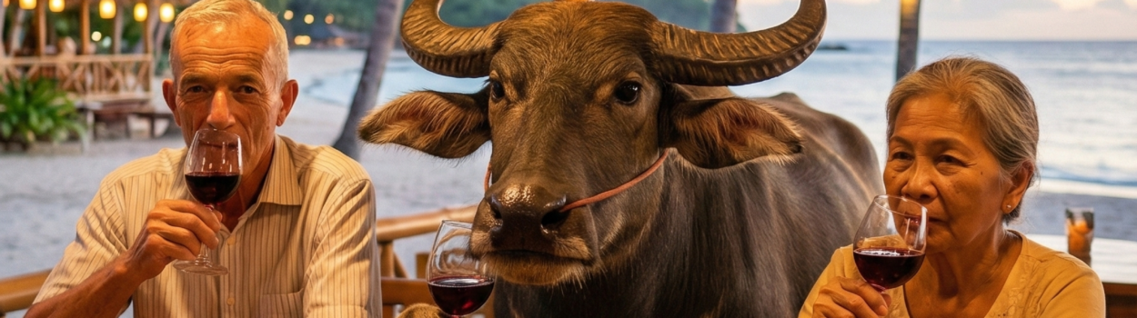 Die Luft an diesem Abend war schwer wie nasses Leinen. Salz, verbranntes Laub, ein Hauch Müll – der übliche Dreiklang der Küste. Maria, Doppelbürgerin Philippinen/Schweiz, Besitzerin des wohl besten Resorts hier am Platz. Ihr Mann, Schweizer, war hier nur das Anhängsel. Mit Minderheitsbeteiligung. Ausländer dürfen in den Philippinnen kein Grundstück besitzen. Wir sassen an der Bar des besten Resorts im Ort. Ein Glas Carmenere aus Chile, rosa Abendlicht wie Elton-John-Gläser über allem. Brille von Elton John. Das wird eine andere Geschichte, die Brille, nicht Elton John. Verzeihung, ich will nicht abschweifen.