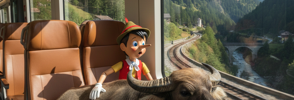 ​Pinocchio wartete in Zürich. Er sah nicht glücklich aus. Er stand da wie eine hölzerne Mahnung an die Unpünktlichkeit der Welt. „Wir müssen nach Italien, Carabao!“, rief er. „Dort wartet die Erkenntnis! Es ist schlimmer als die Illuminati “.