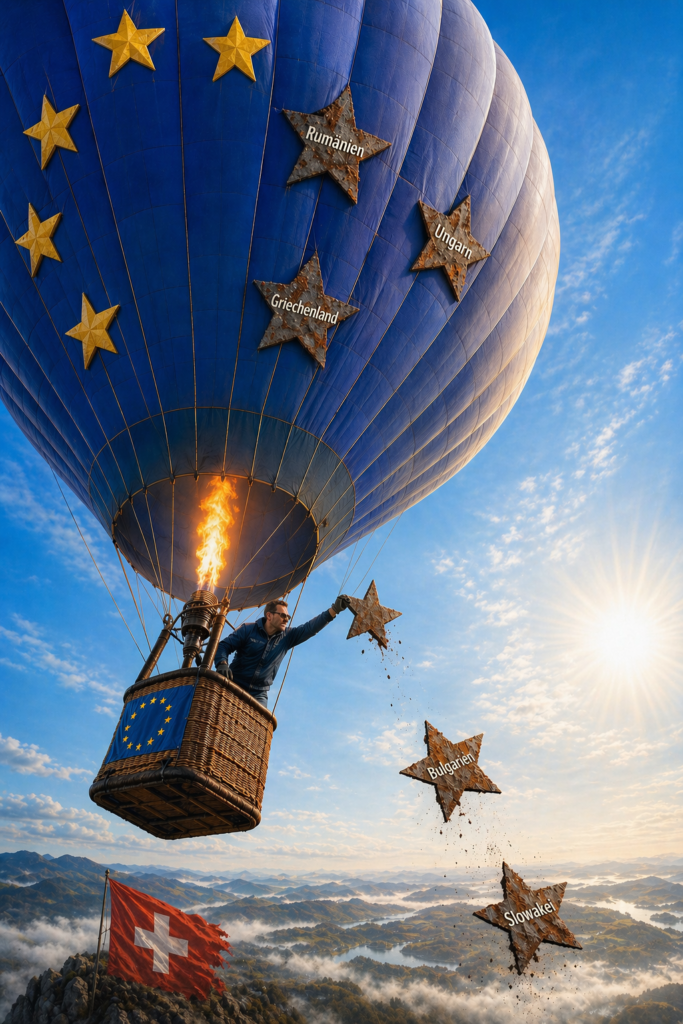 Es geht nicht um Grösse. Es geht um Kongruenz – eine Union, die in dieselbe Richtung zieht, ist geopolitisch stärker als eine grössere, die sich selbst blockiert. Der Ballon steigt nicht trotz des abgeworfenen Ballasts, sondern wegen ihm. Wer Bulgarien oder die Slowakei aus dem Gleichgewicht rechnet, verliert statistisches Rauschen. Wer sie im Boot behält, riskiert den nächsten Orbán.